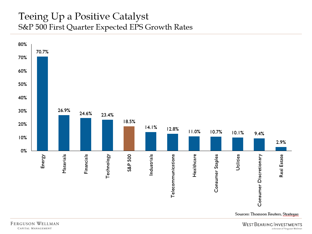 With this week’s latest rebound, the S&P 500 has now closed up or down more than 1 percent 27 times year-to-date ‒ this is more than three times the daily volatility that investors experienced in 2017. Accompanying higher stock prices, safe-haven bonds retreated modestly. While continuing uncertainty about trade policy and geopolitical risk are contributing factors to price swings, investors are now beginning to look forward to something more fundamental ‒ first quarter earnings. A shift in focus may be just what stocks need to break out of their recent trading range. As the chart below depicts, earnings for the S&P 500 are anticipated to rise to a “high-teens” percentage, with leadership from the commodity sectors, technology, and financials.