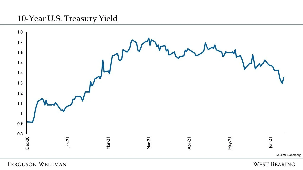 The yield on the 10-year U.S. Treasury peaked in March and has been steadily declining ever since.