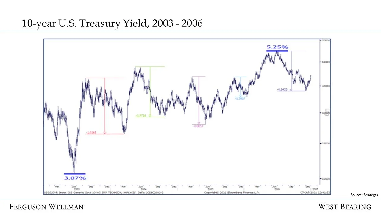 Our friends at Strategas shared this great chart on the 10-year yield grinding higher from 2003 through 2006. There were several reversals up and down as interest rates moved from a low of 3.07 percent, to a high of 5.25 percent.