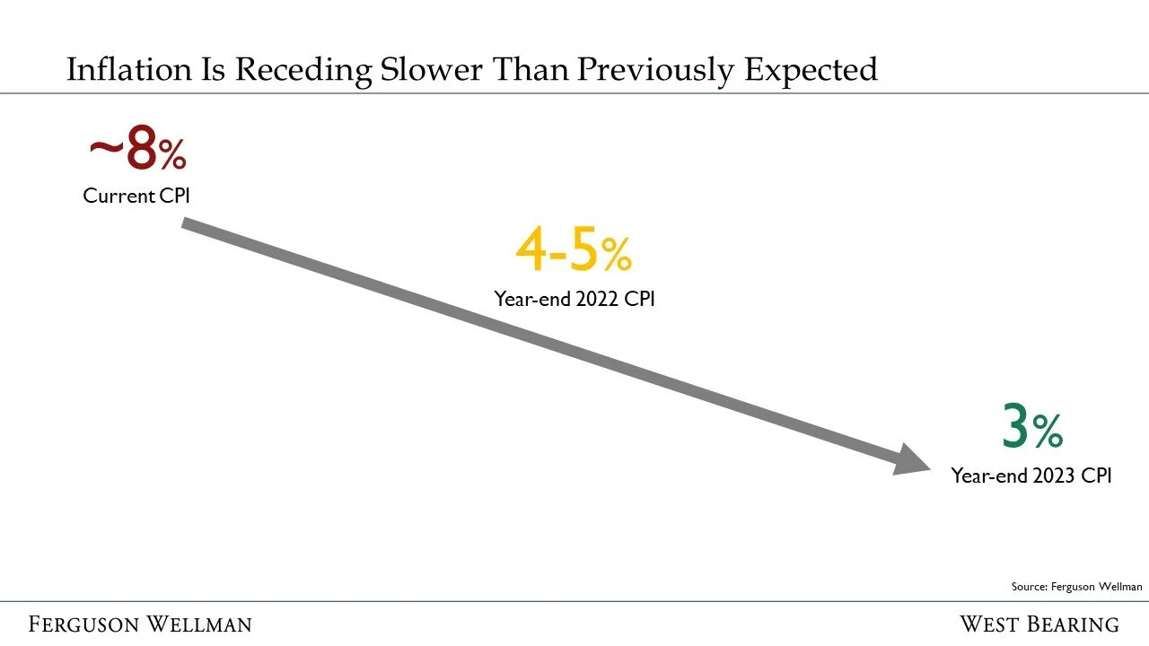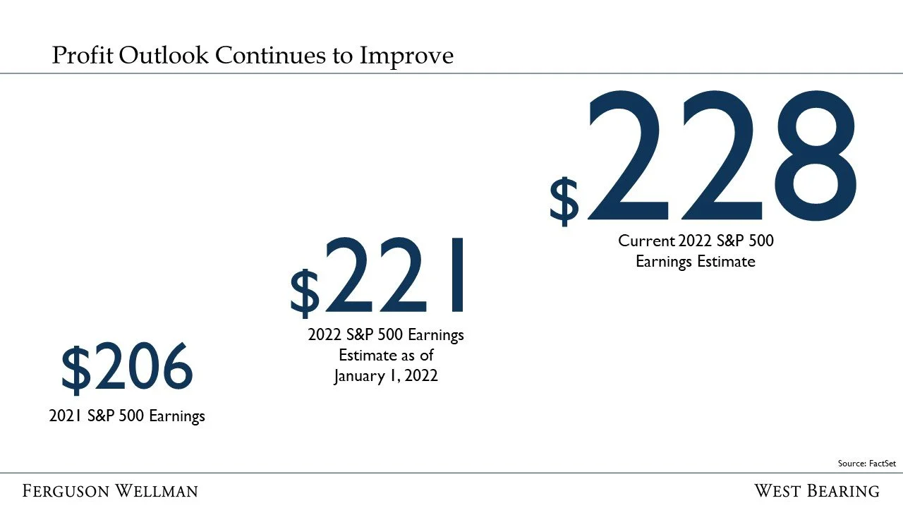 Despite a challenging backdrop of geopolitical conflict and inflation, we continue to expect stocks to outperform bonds. As it always is, this outlook is grounded in earnings. The chart below portrays expected growth in 2022 profits that has improved from beginning of the year levels amid strong pricing power being realized by America’s leading companies.