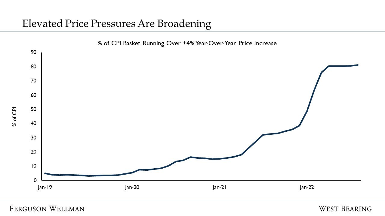 Early in this economic recovery, inflation was driven by a few idiosyncratic and pandemic-specific categories like used cars and car rentals. As the chart below indicates, over 80% of the composition of the consumer basket measured by CPI is now running at double the Federal Reserve’s 2% inflation target. This week’s report further confirmed that the Federal Reserve still has their work cut out for them.