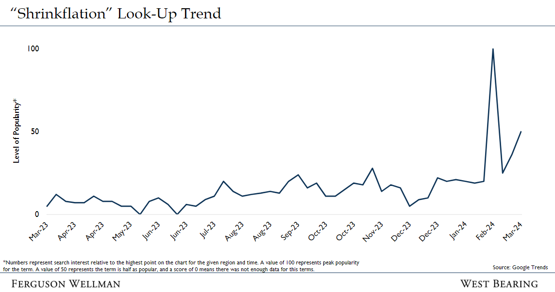Over the last month, the term Shrinkflation has become more popular in the media. The term was broached by President Biden during a Super Bowl interview earlier this year, but has been gaining traction more recently (see chart below on Google search trends) due to a proposed bill in Congress, as well as Sesame Street’s Cookie Monster complaining on X (formerly Twitter).
