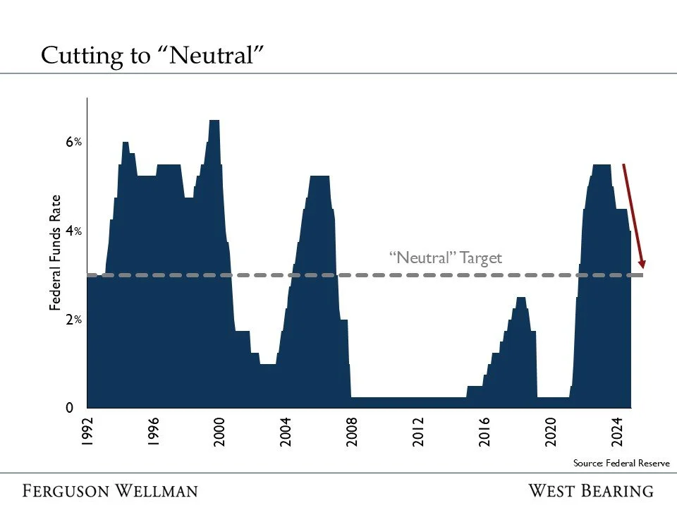 The current expectation is that the Fed will cut its policy interest rate by another 0.25% at its upcoming December 10 meeting; the third rate cut this year. Additionally, this would also mark the sixth cut in the current rate-cutting cycle, which began in September 2024. For the last several years, the Fed’s policy rate has clearly been set in restrictive territory, to combat legacy inflation from the pandemic and, more recently, to offset potential inflationary impulses from increased tariffs. Given strong corporate earnings and continued momentum in the U.S. economy, the Federal Reserve is likely targeting only a return to a neutral interest rate, which, in their view, neither stimulates nor restricts our economy. This “neutral” level cannot be accurately determined; however, based on the Fed’s own projections, it is roughly a 3% Federal Funds rate. Given that framework, and as you can see from the chart below, spanning back to 1992, this implies the Federal Reserve may have only a couple of additional interest rate cuts left in 2026.