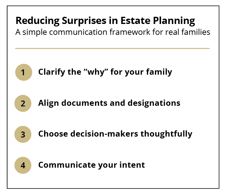 Even a well-designed plan can create tension if beneficiaries are surprised by it. Proactive communication during life can help reduce misunderstandings and create an opportunity to hear concerns and explain intentions in plain language.