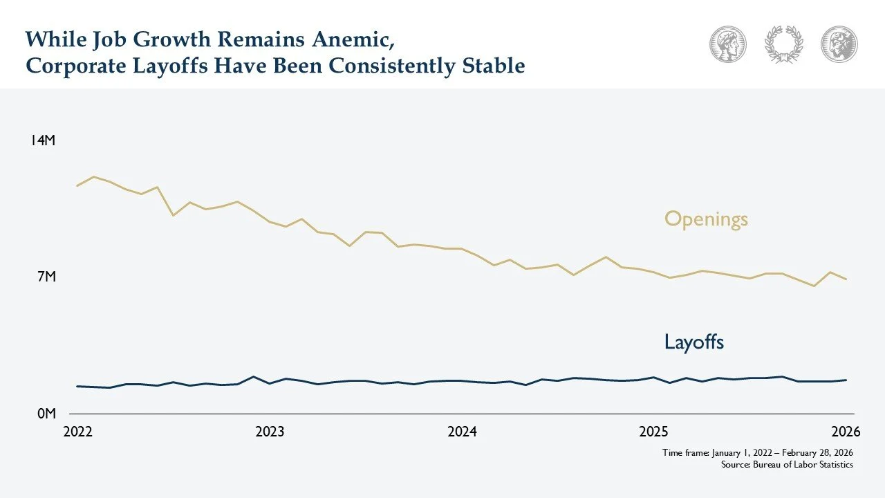 The latest ADP employment report points to continued job creation in the private sector, with gains modestly exceeding expectations. While important, the ADP employment report and the Bureau of Labor Statistics (BLS) non-farm payrolls can be different directionally. ADP measures private payroll data from its client base, while BLS conducts a broader survey covering both private and public employment. On Friday, the BLS will release the March jobs data, with economists broadly expecting a modest rebound in hiring, with payroll growth in the range of roughly 55,000–60,000 following February’s unexpected decline. A metric we closely follow is layoffs, which prove to be stable and in line historically.